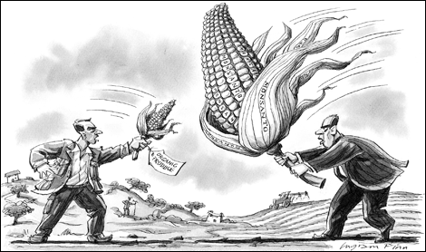 While corporations may have the ear of government, significant opposition exists among thinking people worldwide to the application of GM technology to food production and introducing genetically modified plants ands animals into the natural systems that have been sustaining us forever. Many examples exist of the corruption of natural reproduction processes, pollination etc when GM crop plants have been grown adjacent to natural crops and the reaction of the corporations advocating GM technology has been extremely aggressive toward traditional farmers whose crops have been corrupted by the natural disbursement of GM material into their crops…most famously, the litigation of farmer Percy Schmeiser in Bruno, Saskatchewan Canada pursued by Monsanto when pollen from the corporation’s “round-up ready” GM canola (trademarked as the property of Monsanto) corrupted his non-GM crop. (Read more at: Monsanto vs Farmers: http://www.i-sis.org.uk/MonsantovsFarmers.php).