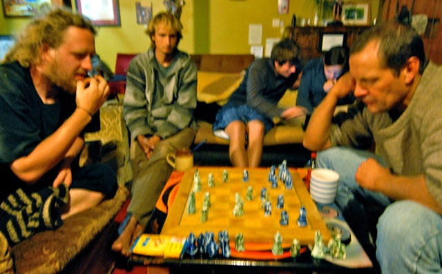 Andreas "Andi" Diller (left) and Samson Jesus Elijah Lewis Arthur Gordon Jackson vie for chess glory at the Rongo Chess Pavilion at Rongo Backpackers & Gallery in Karamea, New Zealand.