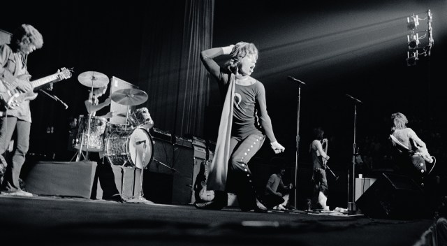 Bouquets fly. One hits Mick in the face. Mick tries to stamp out a big ball balloon that lands on stage. He can’t push his foot through it. One saddens. Mick runs over, jumps up, kicks one of his fiddlers in the ass. The fiddler smokes a smile back, gently, full of knowledge: like, the pay is good.