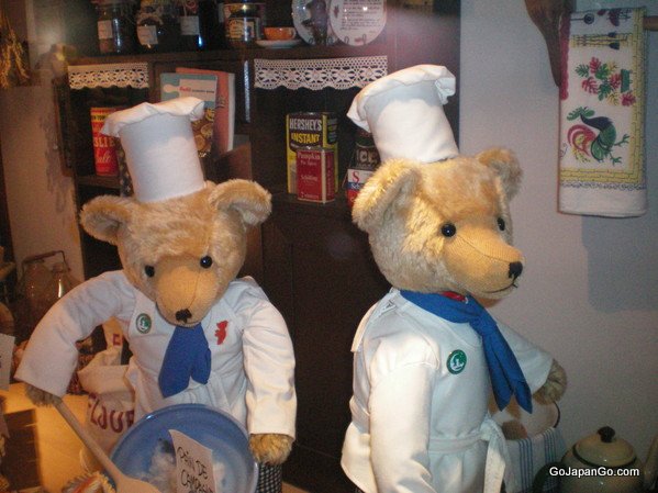 A stroll through the village offers insight into local rural life in the Edo Period (1603-1868). The social structure of the time shows in the different styles of houses. The Taguchi house is the largest, as the family was head of the village for several generations. The house is about 30 meters long and has a large meeting room for group discussions. Tanaka’s house is a simple earthen floored farmhouse. Maeda’s house has a beautiful geometrical design and stands out from the rest – the home of a wealthy timber merchant. Each house has a wood fire with embers smoldering to control humidity, deter insects and keep the thatch dry. The musty smell of the earthen floor and the sharp odor of wood smoke enhance the experience and add authenticity. Domestic utensils, wood craft tools and weaving looms are placed about the rooms, imparting a feeling of life and the sensation that the occupants might return home at any time. The Hida Folk Village overlooks the city from the mountains that surround it. The view shows how quickly the city is being changed by the modern plague that is transforming it into just another indistinguishable Japanese town. Gray, functional, practical, without aesthetics, emotion or character. Visit now before all is lost. After all that culture you may be ready for the gimcrack trumpery of the new Teddy Bear Museum at the base of the hill leading to the folk village. Here you see rows and rows of – surprise! – teddy bears.