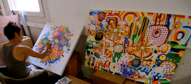 Shota Kawahara, a painter from Japan, is preparing to show his work at Re-Invent on August 17. Kawahara studied visual art at the prestigious Kyoto University in Japan and is currently a resident artist at Re-Invent. His acrylic works are nature-inspired, abstract, bright, vibrant, colourful and very, very happy…a Kawahara on your wall will bring much joy into your home and the messages in his intricate work will keep your mind active forever.