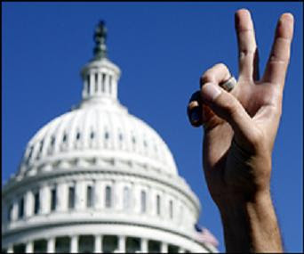 A 2003, Los Angeles anti-war protester making the peace sign.