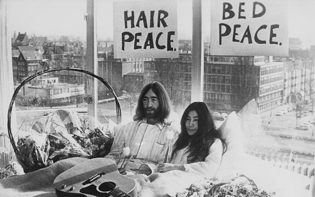 Beatle John Lennon (1940 � 1980) and his wife of a week Yoko Ono in their bed in the Presidential Suite of the Hilton Hotel, Amsterdam, 25th March 1969. The couple are staging a ‘bed-in for peace’ and intend to stay in bed for seven days ‘as a protest against war and violence in the world’. (Photo by Keystone/Hulton Archive/Getty Images)