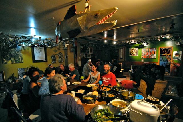 Pot-Luck dinners are slightly different in that we ask everyone staying with us as guests to make their signature dish…we always crank up the competition among the different nationalities of guests by saying things like, “Well, I really love Italian food, but think Greek food is even better.” Or, “Japanese food is amazing, but I love Korean food much more.” Such statements ensure the best quality dishes from around the world as everyone is quite proud of their national cuisine…except English people, who are culturally conditioned to eat over-cooked, nutritionally bereft, grey dishes made from boiling the Christ out of anything.