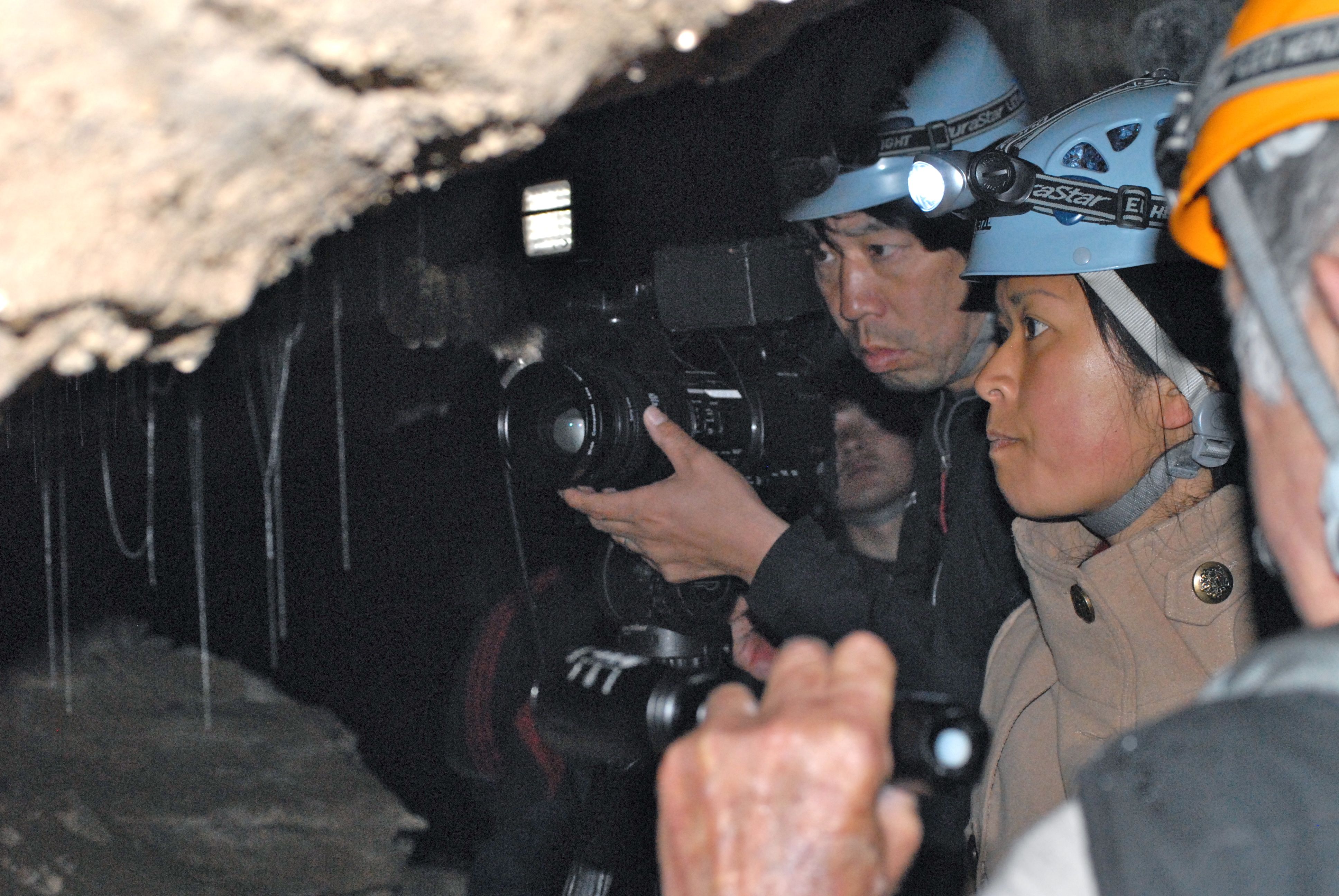 Honeycomb Cave Guide Bill Jackson (right) Shows Sanae Murray and the TV Crew the Glow Worms in the Honeycomb Caves