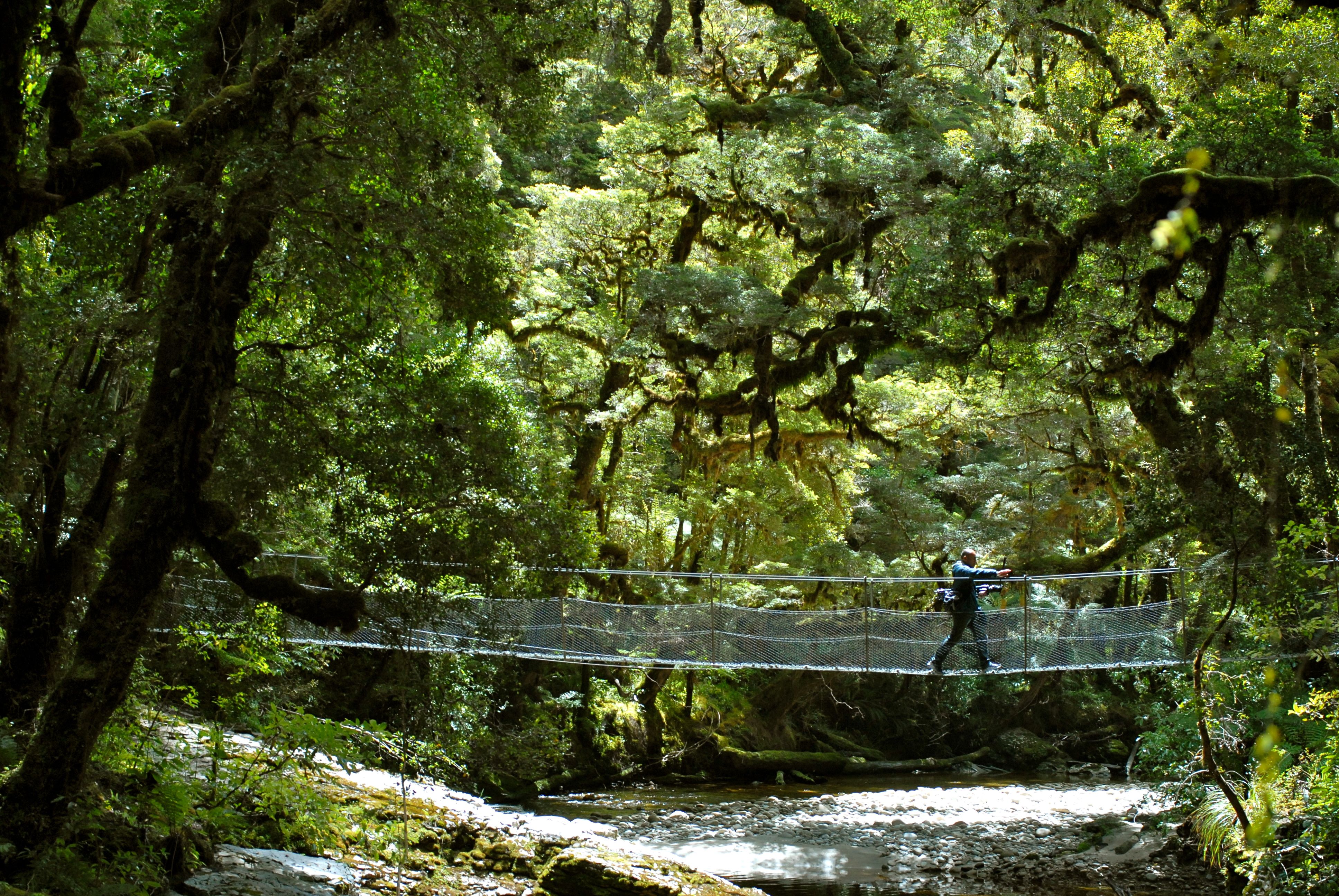 Coordinator and Translator Kenichi Ogiyama on a Swingbridge in the Enchanted Forest of the Oparara Basin