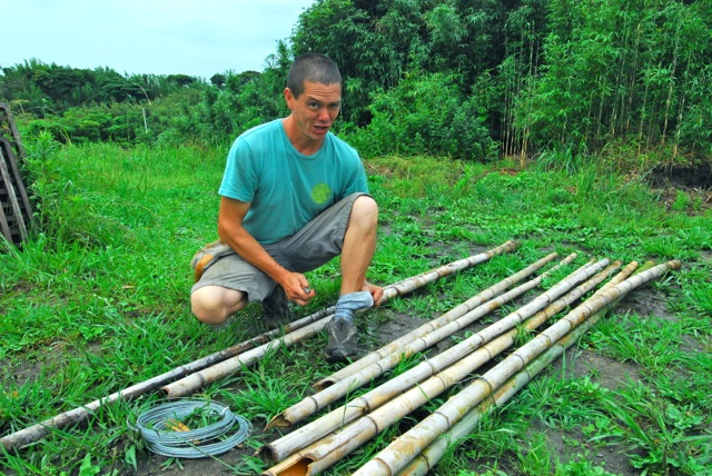 Yoshihiro Iida (left) and Phil Cashman construct a bamboo trellis for climbing beans in the gardens at Permculture Awa Farm