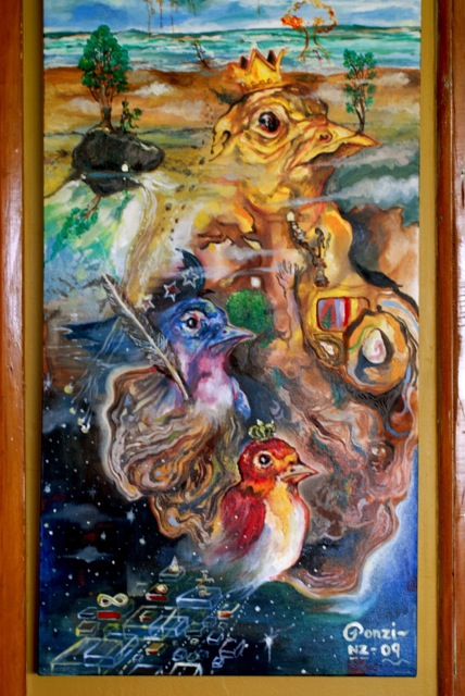 Shota Kawahara from Japan was another artist who discovered at the LivingInPeace Project as a traveller. He stayed several times at Rongo as a guest and as a Wwoofer (volunteer) to help run the hostel and the permaculture farm. Kawahara, a graduate from the famed Kyoto University art school, then stayed on as a resident artist and was unique in his ability to paint in the public gallery space while being asked questions and conducting conversations as he worked. He even recruited other travellers to assist him with his painting. Several of his works now form part of the permanent collection in the Rongo Gallery.