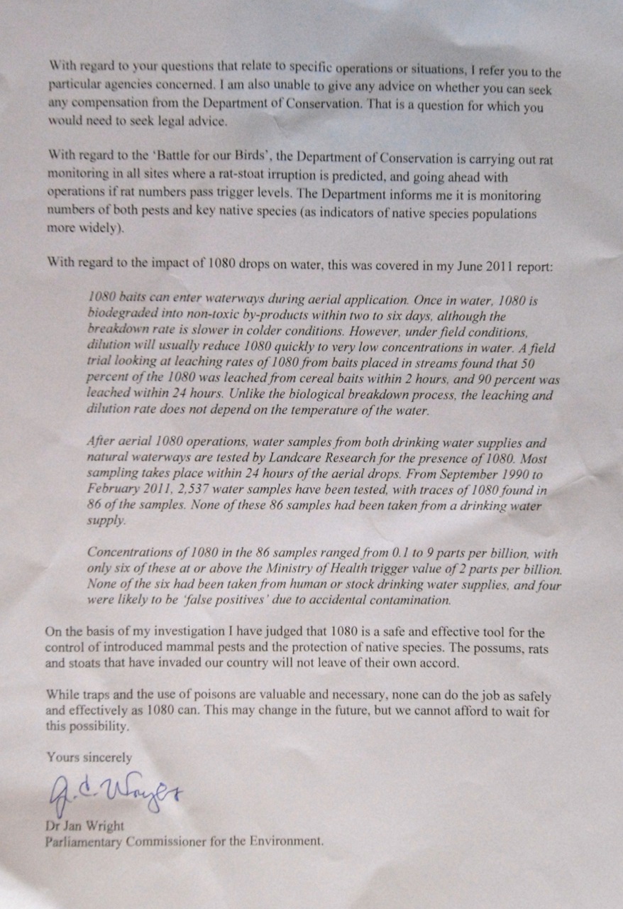 After Dr. Wright’s report was published in 2011, it was peer-reviewed by Dr Jo Pollard, who has a doctorate in zoology and would seem eminently more qualified to assess the scientific information pertaining to the use of 1080 in New Zealand and the effect of the poison on invertebrates that Dr Wright, who has a degree in physics, another in energy and resources and a doctorate in public policy.